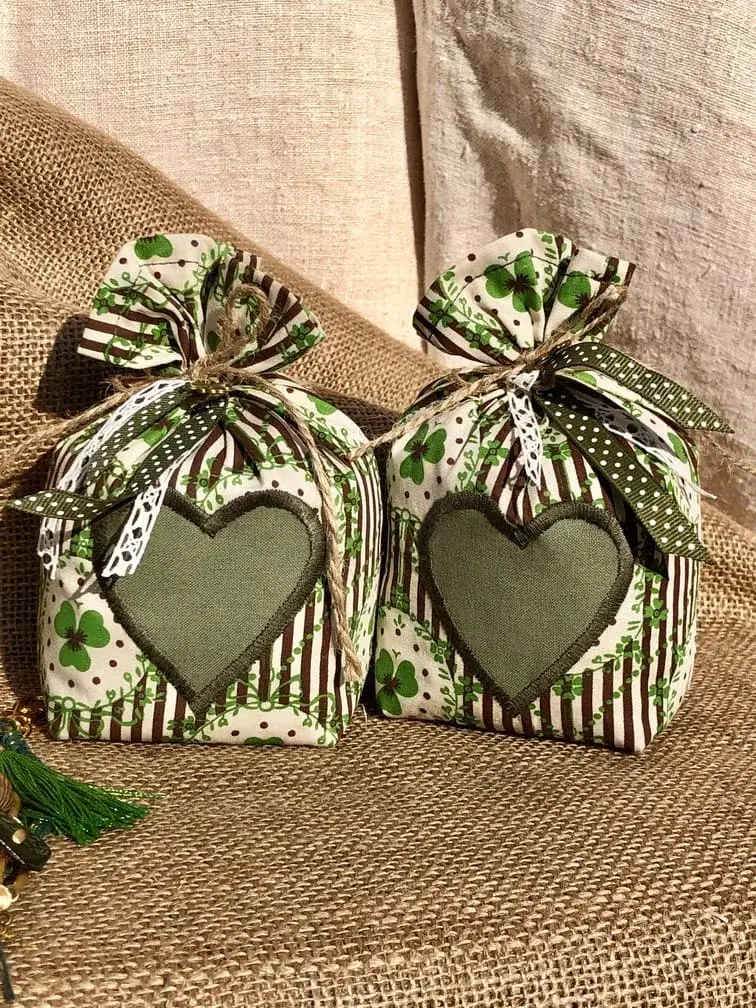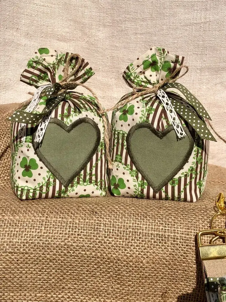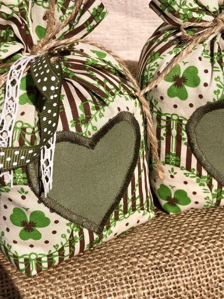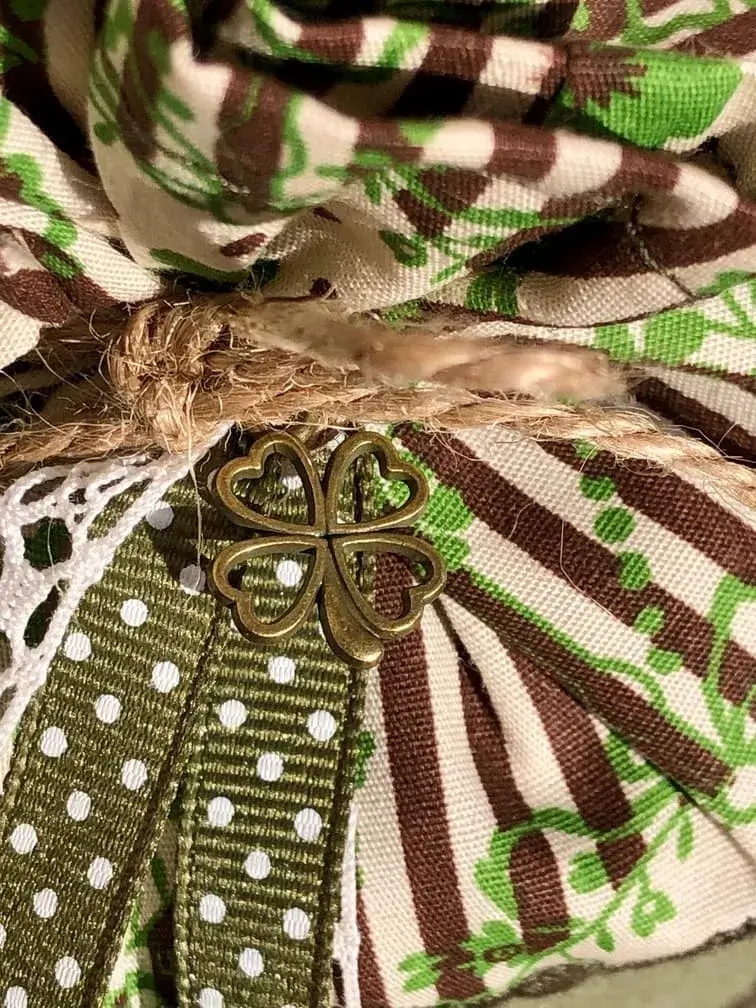 il mêle textile vintage, ruban à pois, dentelle, charm en forme de trèfle à quatre feuilles et lavande séchée.