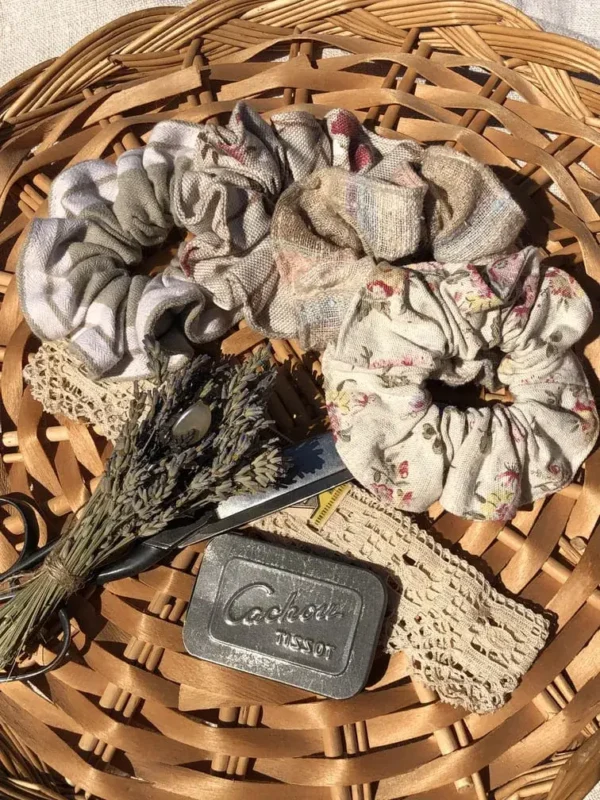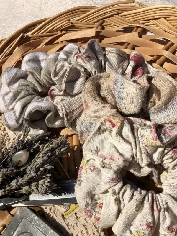 Ce lot chouchous naturel fleuri est confectionné avec les chutes de tissus utilisés pour les créations.