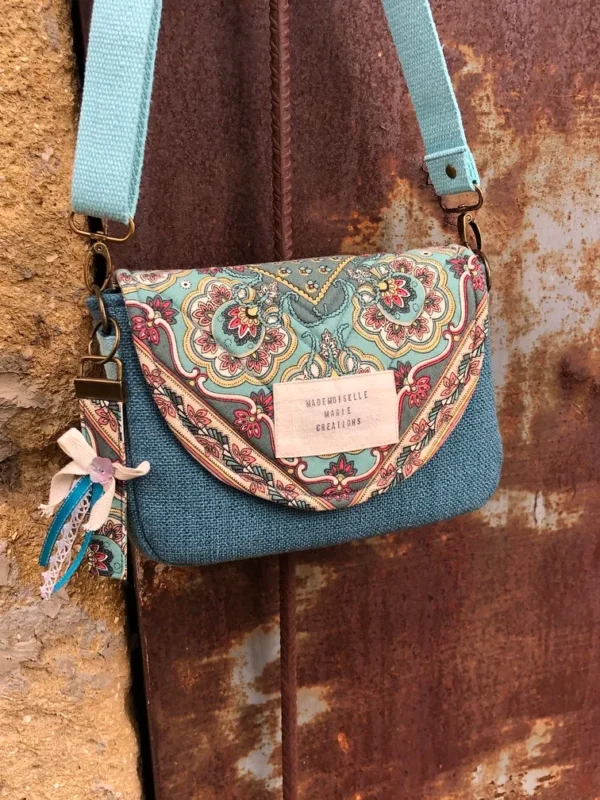 Pour cette version, Mini Musette se pare de 2 toiles qui se complètent : la toile provençale à motifs fleuris avec des arabesques et la toile d’ameublement bleue.