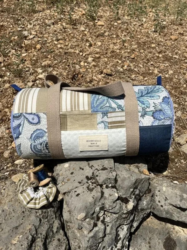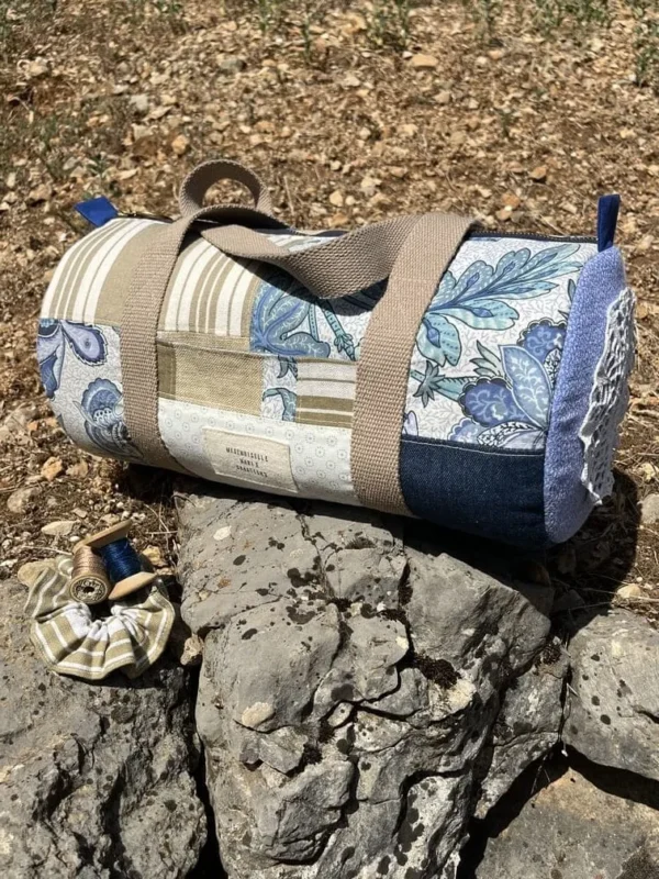 Sac polochon « Maurice » patchwork bleu beige, porté épaule.