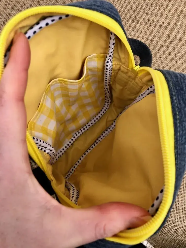 • Matières upcyclées : toile de jeans, nappe brodée motif mimosa, Vichy jaune et blanc, dentelle jaune, galon mimosa, doublure jaune