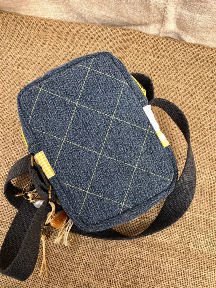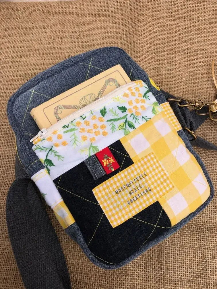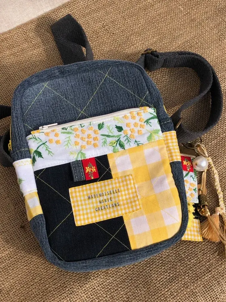 Sacoche patchwork mimosa & jean – Métamorphose textile
